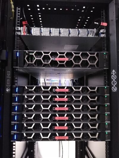 À ce jour, deux clusters sont pleinement opérationnels. Le premier, qui correspond à notre quatrième génération de clusters, est en service depuis 2006 et comprend 980 unités de calcul. Ce système est encore régulièrement optimisé et mis à jour. Le second cluster, représentant notre cinquième génération, a été déployé en 2023 et dispose de 512 unités de calcul. Les serveurs de calcul de cette dernière génération sont interconnectés par une technologie InfiniBand HDR, permettant des communications inter-serveurs à une vitesse de 200 Gb/s.