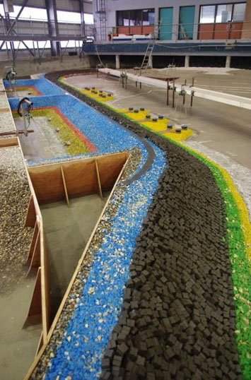 Les essais en canal à houle vont permettre de vérifier le prédimensionnement des sections types de l'ouvrage, soumises à une houle frontale du point de vue de la stabilité des matériaux exposés à la houle, en carapace, en sous-couche, dans la butée de pied, dans les talus avant et arrière et au niveau des structures de couronnement.