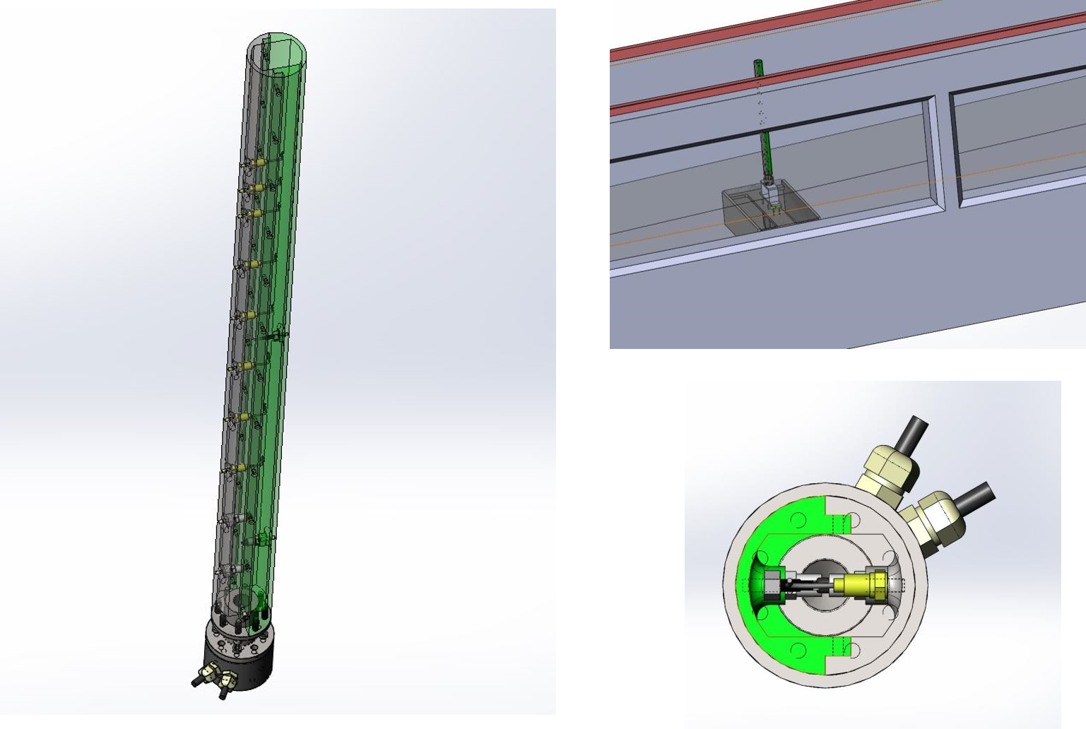 Exemple de l'instrumentation d’une pile de pont soumise à la houle déferlante dans la zone littorale: la métrologie mise en place permet l’acquisition d'une part, des pressions localisées en une dizaine de points de la pile via des capteurs piezo-résistifs et d'autre part, des efforts globaux via une balance d’efforts située sous la pile. Cette double acquisition permet la caractérisation de la structure d’un point de vue global, mais également d’identifier des zones ciblées soumises aux pressions impactantes des vagues dans les déferlements.