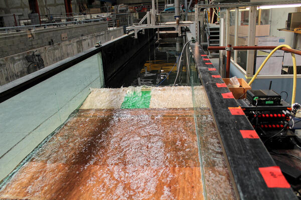 - Mesure des efforts et des pressions impactantes sur la structure soumise aux vagues déferlantes